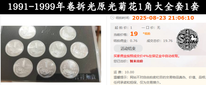 就拿之前拍出的一整套的91-99年的原光卷拆菊花1角,就只拍出了19.76元辛勤。