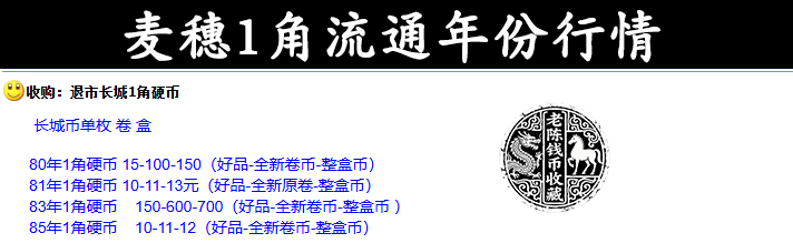 可以看到,现时80年、81年、83年和85年的麦穗1角好品报价永诀在15元、10元、150元和10元。