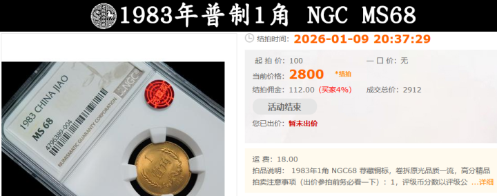 也即是上头这枚1983年的普制1角硬币,凤凰彩票在本年1月9号的当代钱币当代拍卖中,以2912元的价钱被拍出。